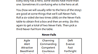 Made some changes to the table of Never Fails that is used for character generation. Trying to broaden possibilities beyond the traditional TTRPG approaches. Inspired in part by my dis-satisfaction wi...